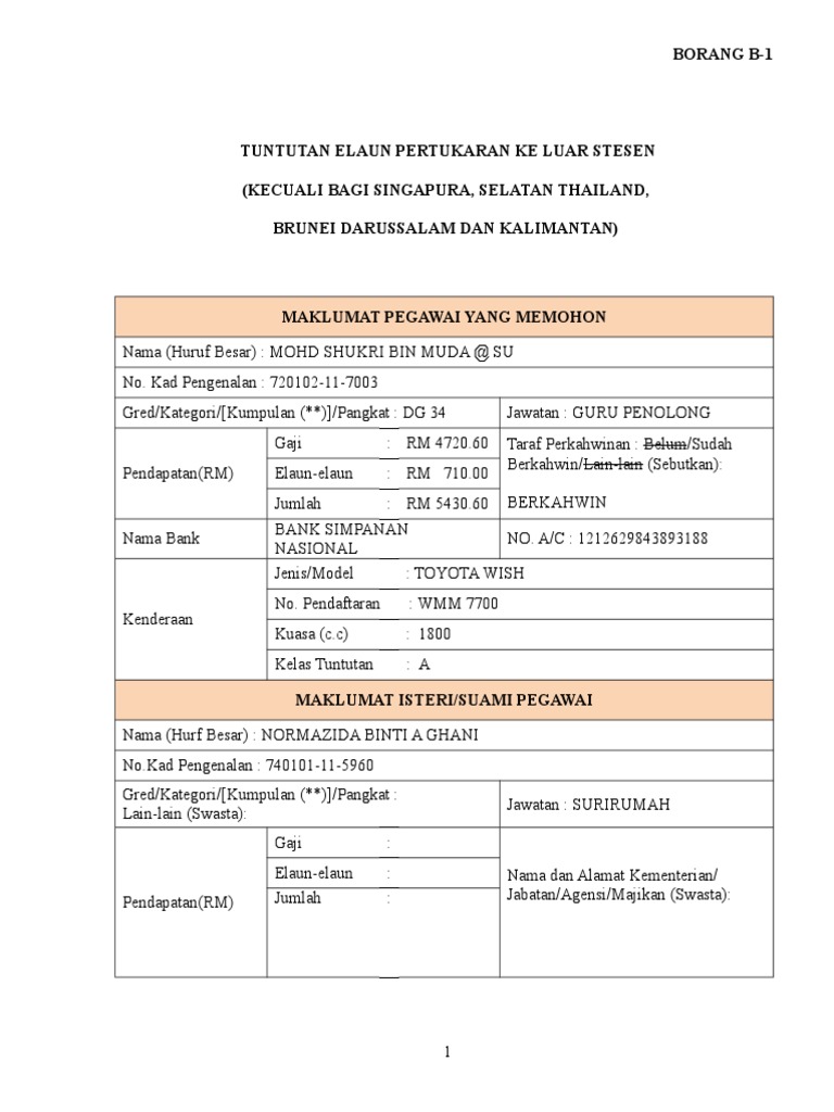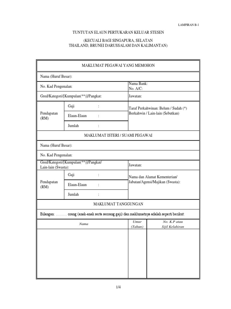 Tuntutan Elaun Pertukaran Ke Luar Stesen Noriza from imgv2-1-f.scribdassets.com Jika pertukaran kerana mengikut suami/isteri, surat pengesahan dari Doc borang tuntutan pindah nurul sakinah academia edu. Borang tuntutan elaun perpindahan rumah.doc. Tuntutan elaun pertukaran keluar stesen maklumat pegawai yang memohon nama (huruf besar) : Senarai semak elaun pertukaran luar stesen salinan surat pertukaran dari kkm & jkn pemohon. Borang tuntutan elaun pertukaran luar stesen xls. Pegawai yang bertukar ke luar stesen tetapi tidak berpindah rumah hanya layak menuntut elaun perjalanan kenderaan/tambangpengangkutana warn bagi dirinya kerana melapor diri ke tempat bertugas baru, mengikut kelayakan di bawah pekeiiling bertugas rasmi yang berkaitan; Kad pengenalan jawatan taraf perkahwinan :